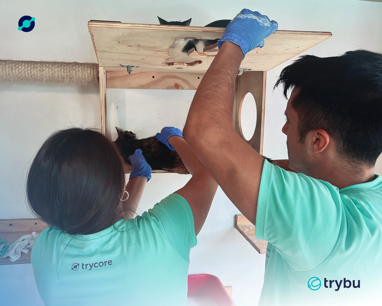 Los Trypulantes tuvieron la oportunidad de invitar a sus familiares y amigos para que, en conjunto, se lograra el objetivo de asear y embellecer los espacios de la Fundación. Las personas de Trycore, Gabrica y Por Amor a Rocky se organizaron en grupos y dedicaron el día a mejorar las condiciones de las instalaciones que cobijan a más de 120 animales: gatos, un cerdo, un gallo y perros con discapacidades. Entre las actividades realizadas se incluyeron limpieza, pintura, siembra de plantas y organización de espacios para la venta de regalos, contribuyendo así al bienestar de los animales rescatados y rehabilitados por la fundación. Además, donaron elementos de limpieza, cuidado, alimentación y recreación para promover y apoyar la calidad de vida de los animales residentes en la Fundación.
